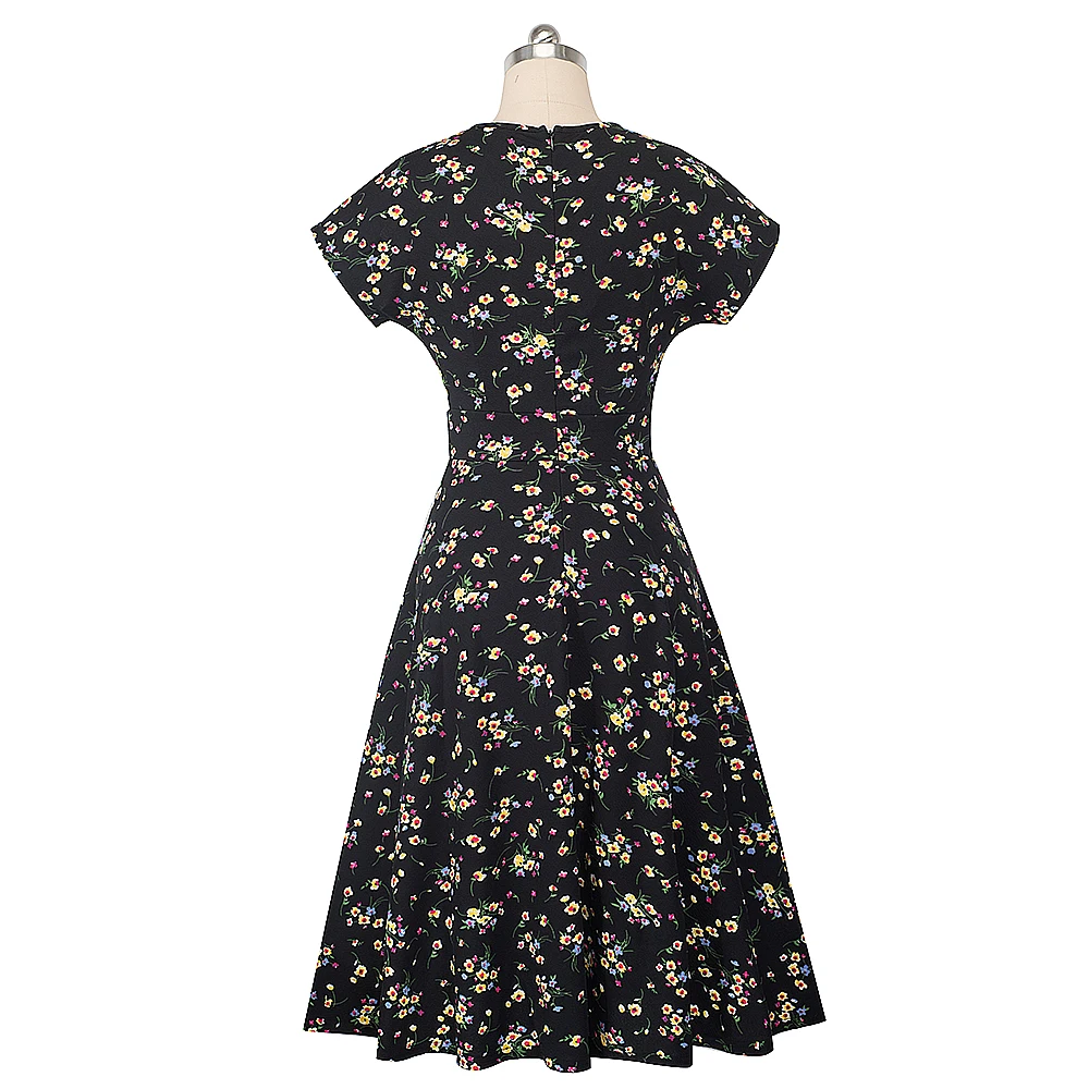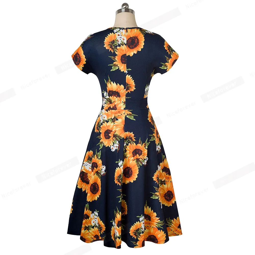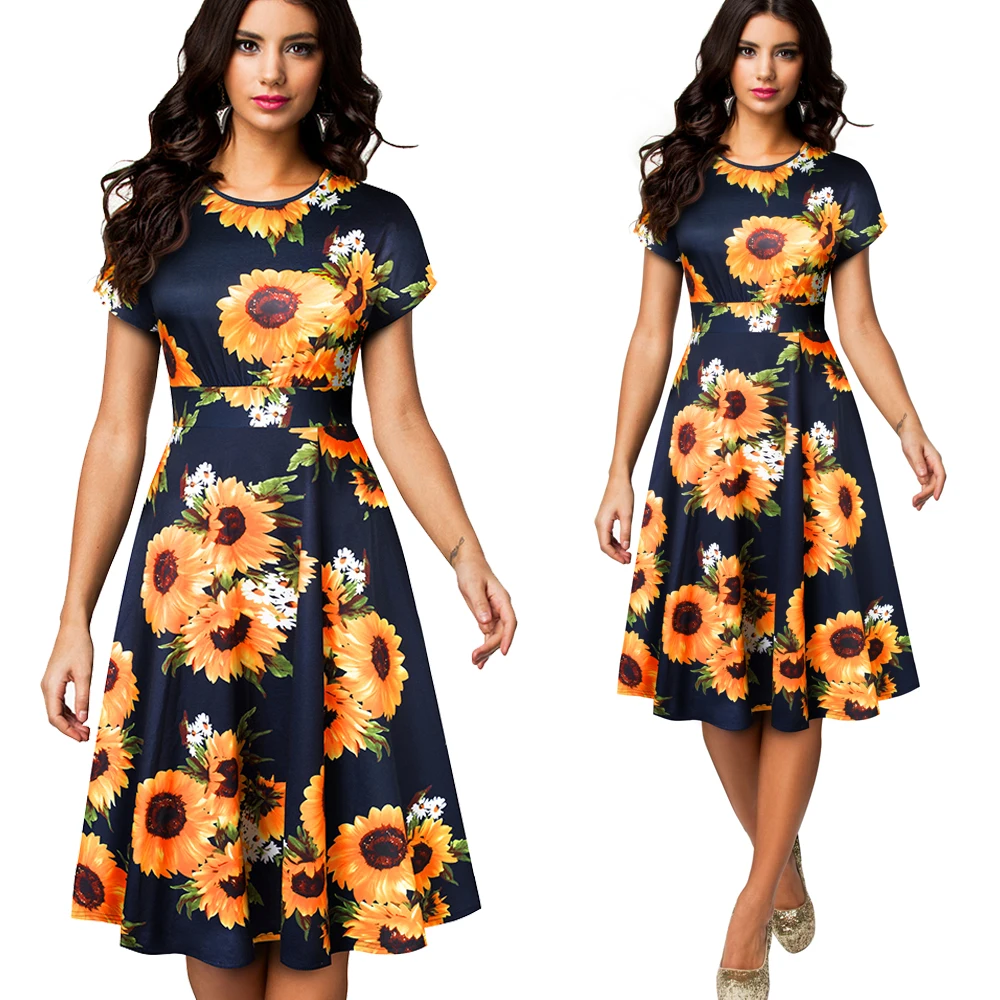 Vintage Retro Sun Flower Printed vestidos Business Party Female Flare Swing Dress